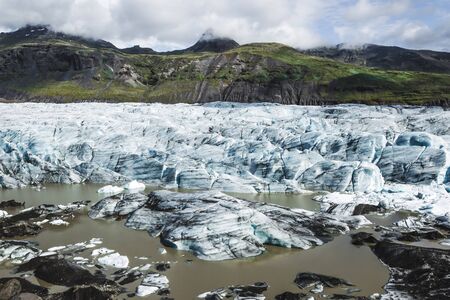 Skaftafell glacier landscape in Svinafell, Iceland. Background of green mountains, ice and snow. Melting glaciers, global warming.
