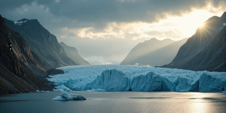 Glacier Mountain Landscape Blue Ice in Mountain Valley Golden Sunlight Dramatic Clouds