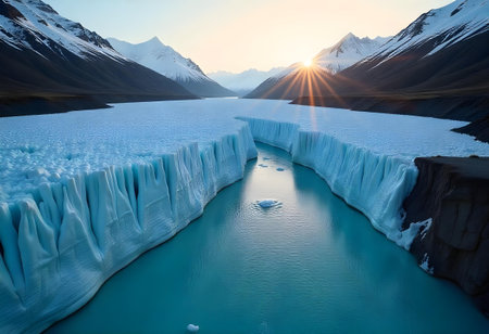A dramatic mountain glacier at sunrise with shimmering ice, deep crevasses, and golden light illuminating the peaks. The pristine and powerful setting captures nature’s grandeur.