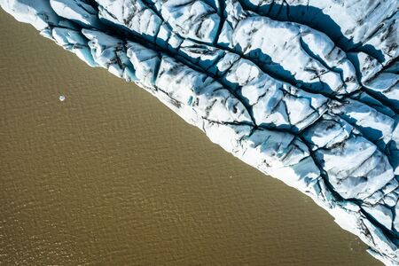 Aerial view of glacier from above, ice and ashes of the volcano texture landscape, beautiful nature ice background from Iceland