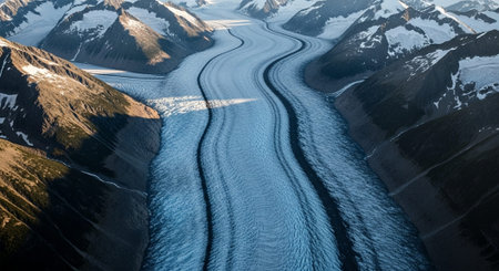Aerial view of a mountain glacier in the landscape of Denali National Park, Alaska, U.S. .