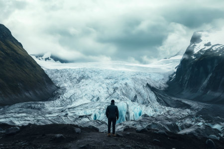 Adventurer with backpack observes dramatic icy glacier field under stormy skies