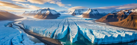 Vatnajokull National Park, one of three national parks in Iceland, the area include Vatnajokull glacier, Skaftafell and Jokulsargljufur.Beautiful aerial photo of ice water and glacier. Panoramic shot.