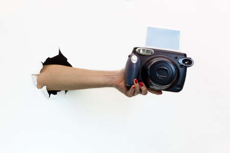 A female hand with a red manicure in a torn hole on a white background holds a camera. Hand through torn white paper