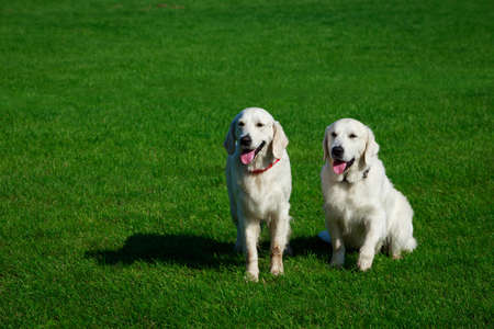 Two Golden retriever dog on a green grass