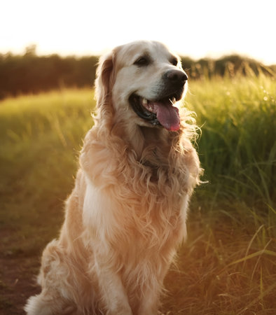 Happy Golden Retriever Playing In A Field At Sunset, Showcasing Its Beautiful Purebred Features