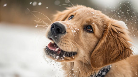 Golden retreiver dog through winter snow season