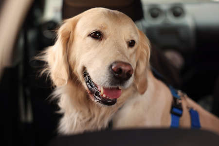 Cute labrador retriever in car. Adorable pet
