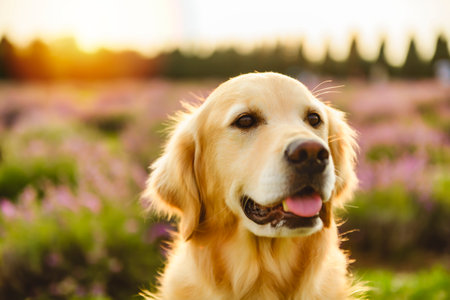Golden Retriever in the field with purple flowers lavender