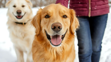 Golden Retriever dog with its owner in the park in winter