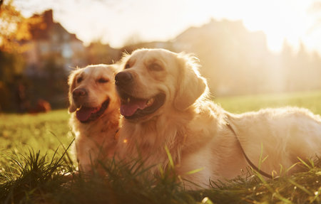 Two golden retriever dogs sitting on the green grass in the park