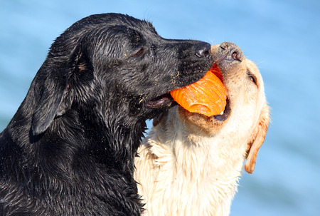 two nice labradors at the sea playing with an orange ball