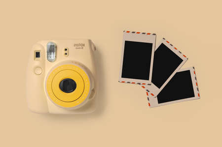 BANGKOK, THAILAND - Aug 05, 2021: polaroid camera Fujifilm Instax mini instant camera on cream color background.