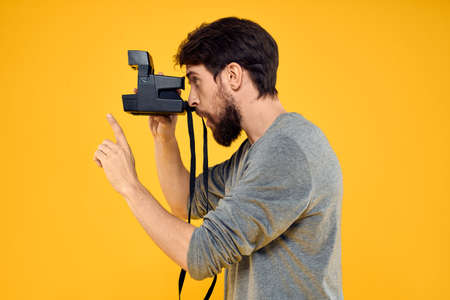 Male photographer with professional photo camera. Professional Creative approach studio yellow background