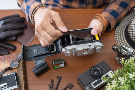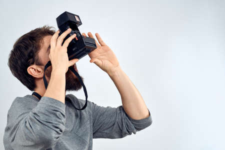 Male casually dressed bearded tourist with a backpack holding retro film photo camera in hands and looking for good angle to shoot. Traveling and freelance concept. Copy space for your text.