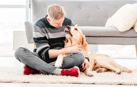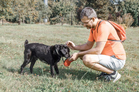 Rainy day with dog in nature. Man holding leaf of burdock above his sad labrador retriever.