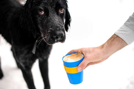 Male hand holding a colorful cup of coffee near the dog on the white background of snow