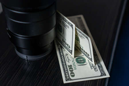 Making money on photography. Photographers income. Money camera. Concept money lens