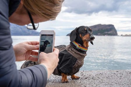 Young woman makes shoot of pretty black and tan dachshund wearing raincoat on mobile phone. Outdoors, stunning sea view landscape background, autumn time, wet weather, gray sky.