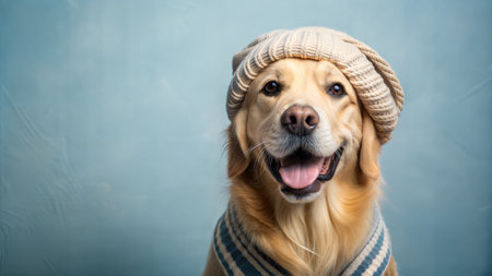 Cute labrador in knitted hat and sweater. Isolated happy dog on light background .Portrait for winter cozy advertisement for knitted pet clothes and other projects