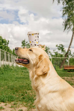 Close-up Portrait of a cute dog breed golden retriever with red ball in his mouth has fun on the beach