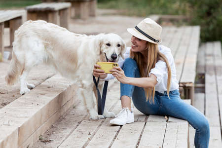 Shot of young amateur photograph woman taking a photo of her dog sitting near the river in the park.
