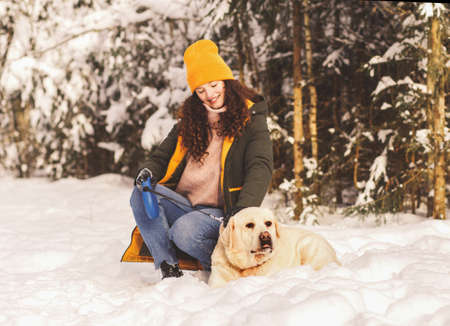 Happy beautiful girl with her white dog Labrador in winter in nature