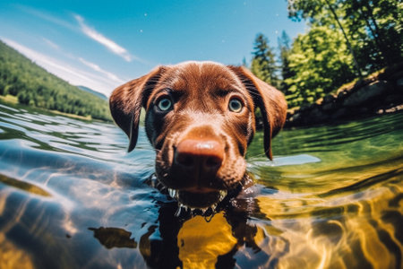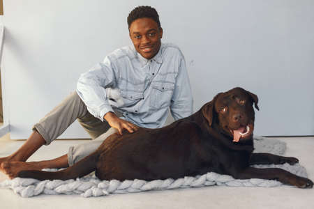 Smiling man taking a selfie with his dog. Generative AI illustration