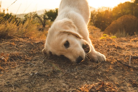 Golden retriever lies in the summer on the green grass in the rays of the setting sun