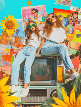 A group of stylish individuals dressed in retro-inspired outfits relaxing outdoors and showing camaraderie. The vibrant colors and accessories contribute to a sense of friendship and nostalgic lifestyle.