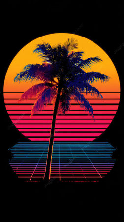 A digitally rendered illustration showcases a palm tree silhouette set against a vibrant sunset. The composition uses vivid orange, pink, and blue hues with horizontal lines. This stylized artwork could be suitable for various applications, including print and digital media for decorative or conceptual purposes.