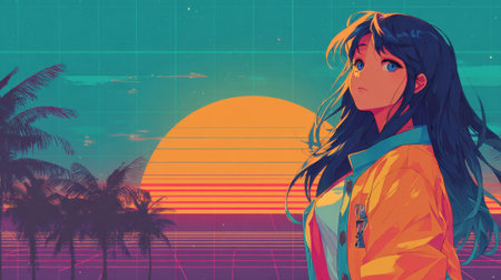 A young woman gazes into the sunset surrounded by palm trees evoking a nostalgic vibe.