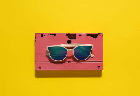 Minimal hipster, youth, summer concept. Sunglasses with a video cassette on a yellow bright background. top view