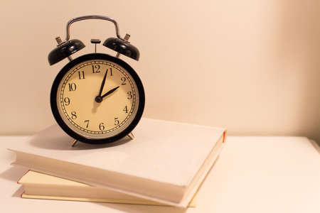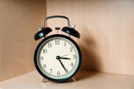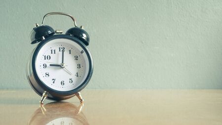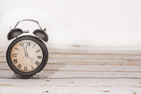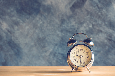 Old fashion alarm clock on top of wooden desk in vintage looks.