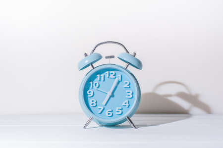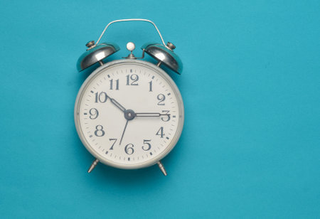 Vintage blue alarm clock on a clean surface showcasing time and nostalgia in a modern setting