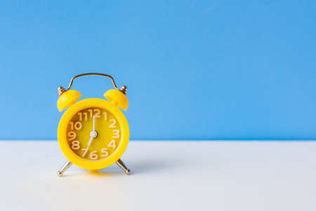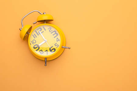Concept of time, reminder, countdown, alert, deadline. Alarm clock isolated on yellow background.Copy space.