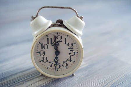 White Vintage alarm clock on wooden floor.