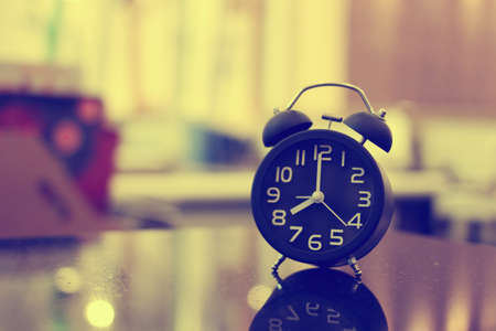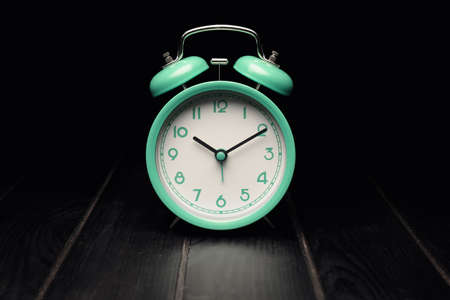 Close up vintage black alarm clock Placed on a black wooden table, blurred background