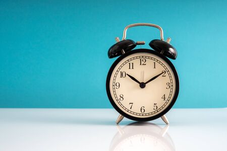 Black Vintage Alarm Clock on Blue Background