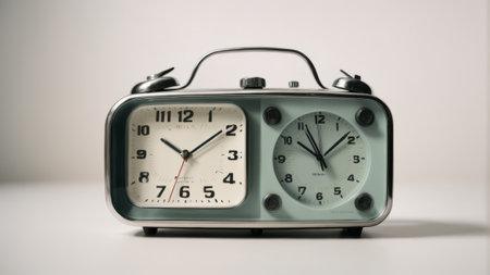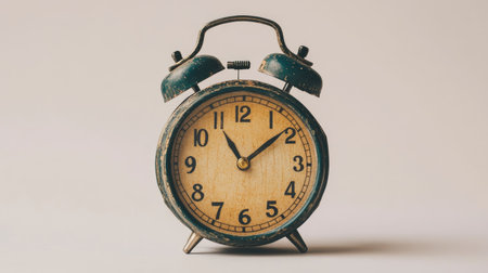 This image features a vintage alarm clock set on a neutral background, symbolizing time management and nostalgia, ideal for a range of creative projects and concepts.