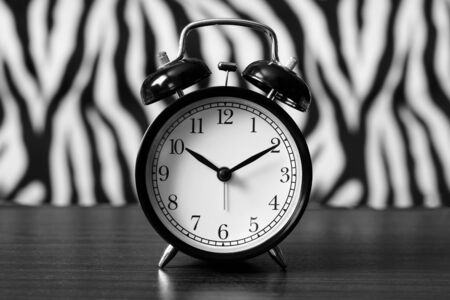 Retro alarm clock on the table in black and white color