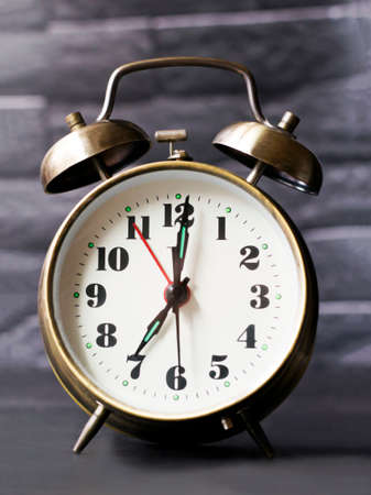 Retro alarm clock on the background of a gray brick wall.