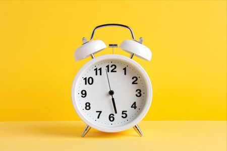 round white alarm clock, five minutes to eight in the morning. Yellow background