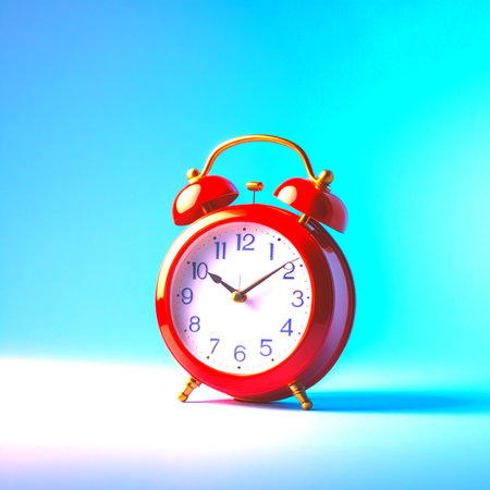 Red analog alarm clock on blue background highlights time awareness, urgency, and visual contrast in a minimalist composition.
