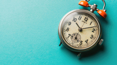 A vintage alarm clock with an elegant design rests on a turquoise surface, showcasing its classic appeal and nostalgic charm in a minimalist setting.