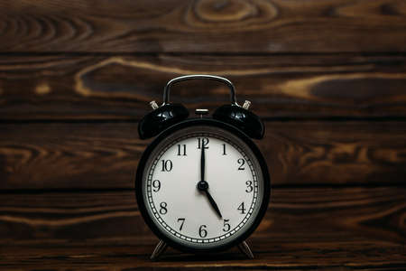Black vintage alarm clock on a wooden floor