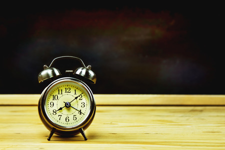 Wooden Background with Alarm clock on Black table