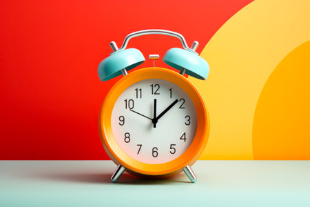 Clock with two hands on table with red and yellow background. Generative AI.