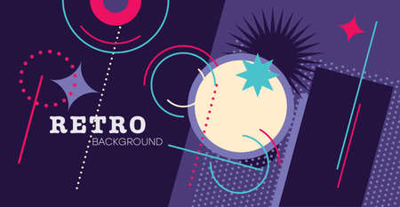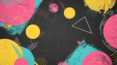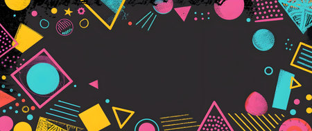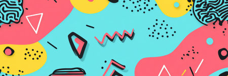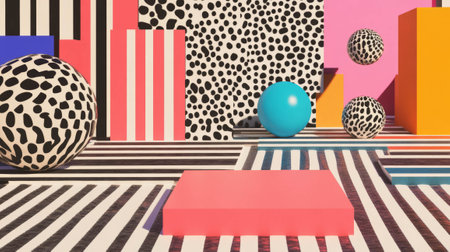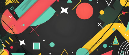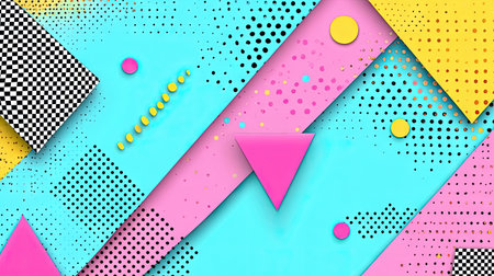 Memphis-style art showcases abstract shapes like zigzags and dots, set against a colorful, dynamic background with playful patterns.