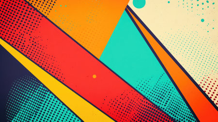 Dynamic composition of geometric shapes in varying colors, including triangles, squares, and circles, layered together to create an eye-catching design. Various patterns, including dots, are incorporated throughout the design. The use of bright, pastel colors enhances the overall visual appeal of the graphic.